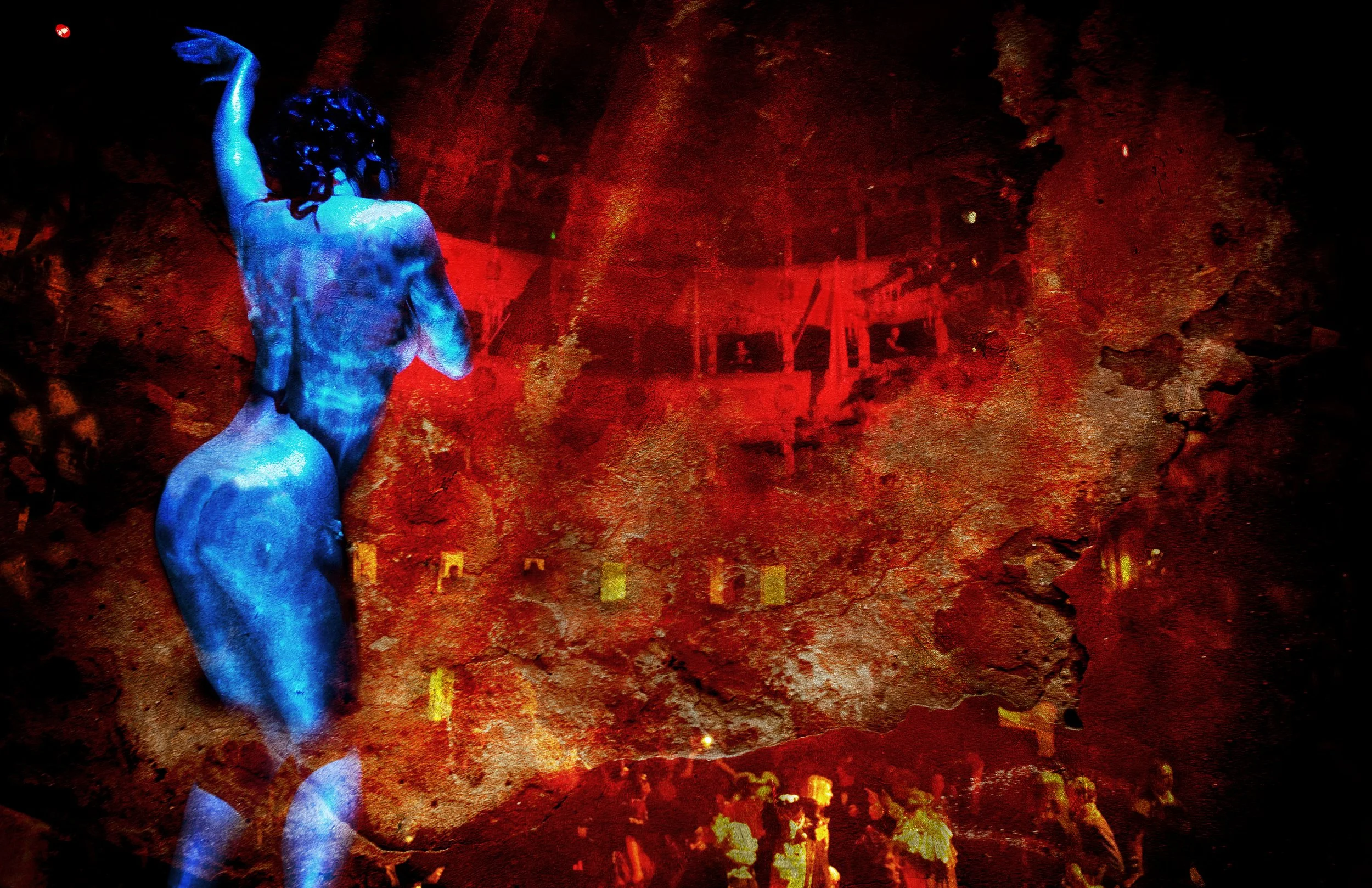 In Venice, as in any ancient city, history is etched upon the walls and the walkways. Centuries of the slow creep of decay–a history of floods, storms, deep freezes and crackling summer heat–have painted abstract passion-plays upon the stone and stucco of the city’s architecture. These walls have seen the rise and fall of the Venetian Empire, the flowering and decline and rebirth of Carnival, the countless dramas of one of the world’s most unusual cities being played out on the streets, along the canals, and in the shimmering lagoon that has always been her greatest treasure. As they say, if these walls could talk, well they’d probably tell the gondoliers to stop singing “O Sole Mio” for Chrissake. When I first began compositing images together in this way, I had no real intention or understanding of what I was doing. It was simply one of those ideas you get, lying in bed, waiting for Morpheus to take you across the bridge of consciousness. But as the first few images began to take shape, I sensed that I was on to something, and I have continued on, without any pre-determined method, combining images and blending them in various modes and levels of opacity, just seeing what happens. Some combinations work, some don’t. Some to me seem utterly sublime, whereas others are more gateways, storytelling devices, ways of filling out the picture. You will notice that some of the images border on the abstract and surreal, whereas others merely add a painterly texture to a more or less realistic image. Towards the completion of a series for presentation, my aims have been geared mostly towards consistency, flow, and color balance, as I have worked to create a kind of a journey that has cohesion as well as variety, and which moves in and out between the sacred and the mundane, between the real and the surreal.